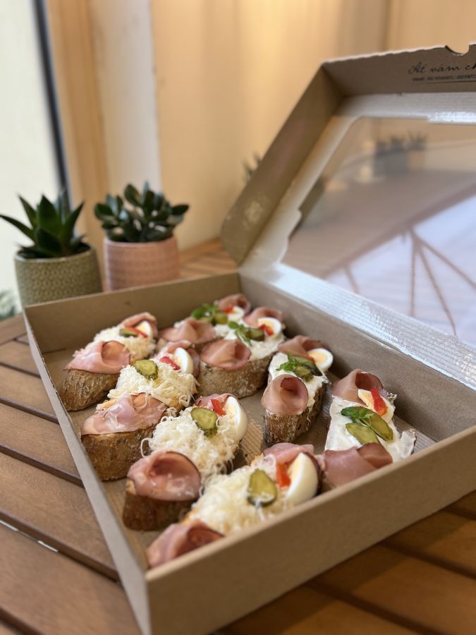 Lehká máslová pomazánka, plátky venkovské šunky, vařené vejce, okurka a čerstvá bazalka. Jemná chuť s nádechem domova.