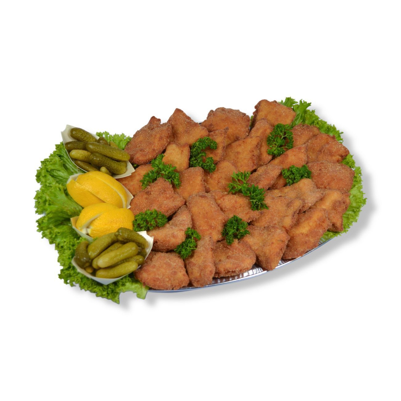 smažené kuřecí řízečky, okurka, citrón, petržel