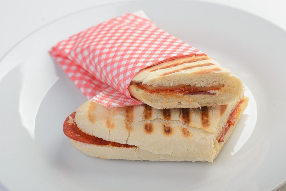 pečivo Panini, dresing speciál, uzený sýr Eidam, Paprikáš, Poličan