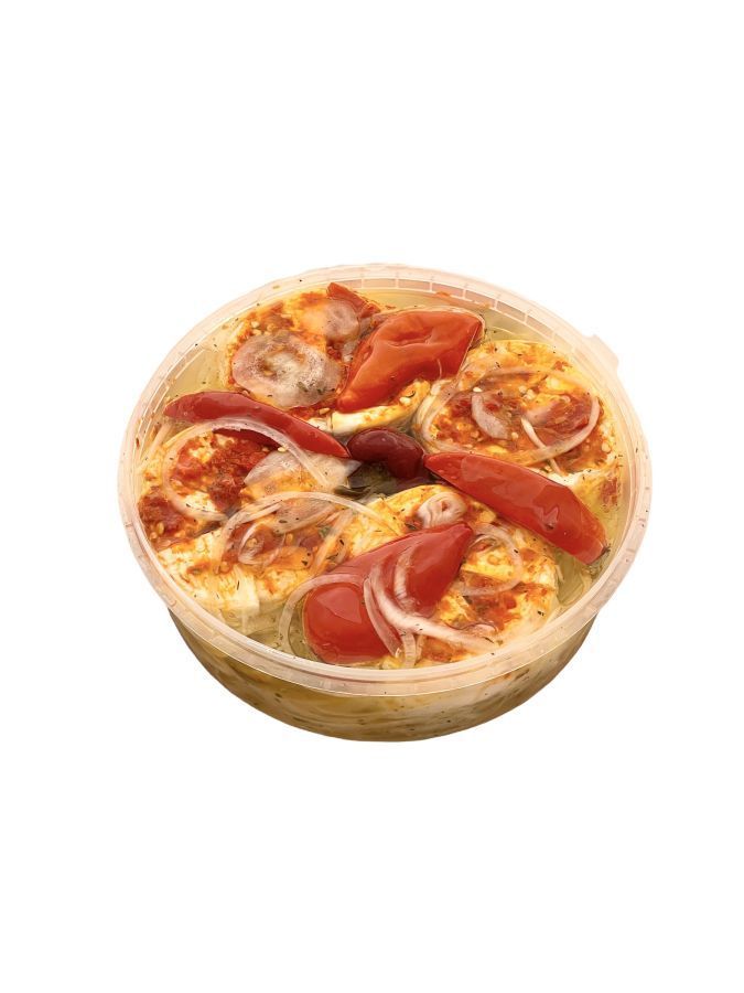sýr Hermelín, čerstvá cibule, feferony, řepkový olej, provensálské koření