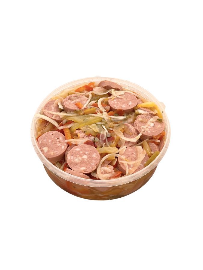 špekáček, paprikový salát, okurky sterilované, cibule čerstvá, kapie sterilovaná, olej rostlinný, hořčice, worchester, pepř, sůl, cukr
